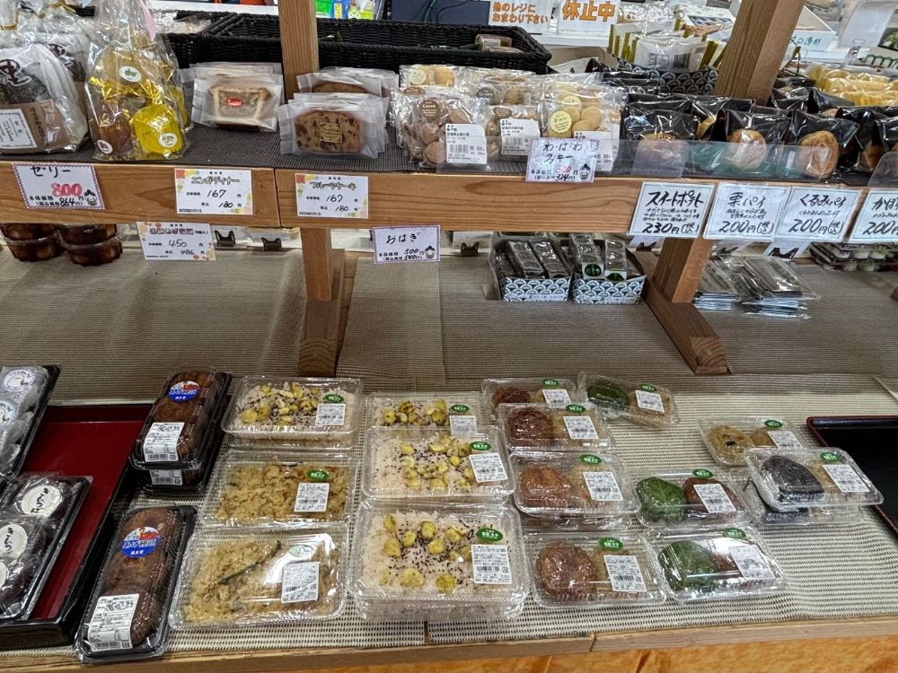 店内に入ると、地元農家の新鮮な野菜や果物、近隣店舗自慢のお菓子とお惣菜がずらりと並んでいました。