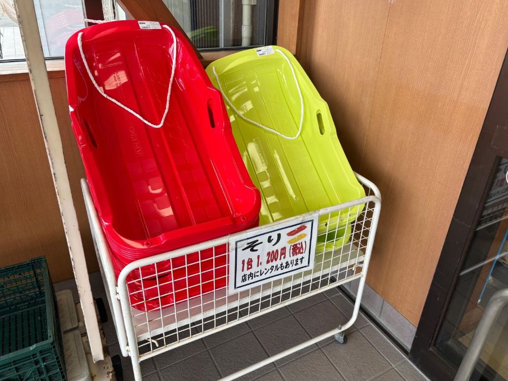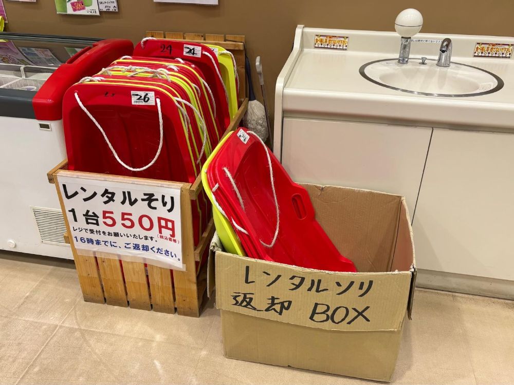 タカカツ万葉パークで使えるソリは、店舗入口で販売、店内でレンタルが行われています。レンタルの場合は16時までに返却が必要です。