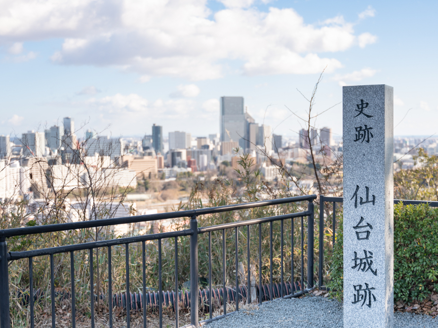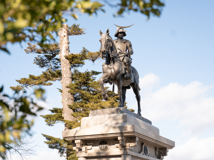 ・伊達政宗公の騎馬像で記念撮影。展望台からは仙台市街を一望でき、冬の澄んだ空気が心地よいです。