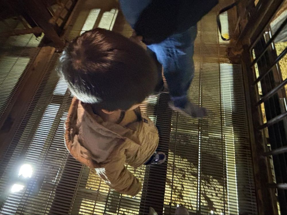 子どもたちも途中、レバーを引いて発破体験をしたり、足元をのぞき込んで高さに圧倒されたりと、普段できない体験に興味津々でした。
