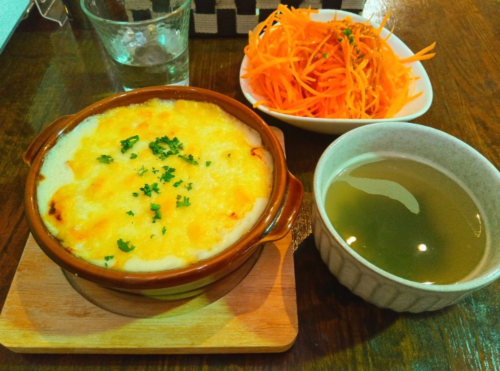 選択肢が多いほど迷ってしまいますが、寒い季節に食べたくなるドリアと、たいむカフェさんの人気メニュー「人参サラダ」(1人前)を注文しました。