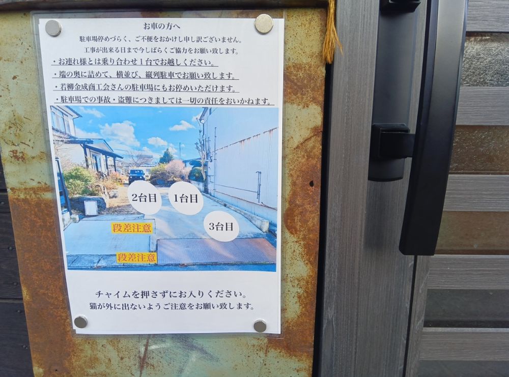 玄関に、駐車場についての案内が掲示されています。