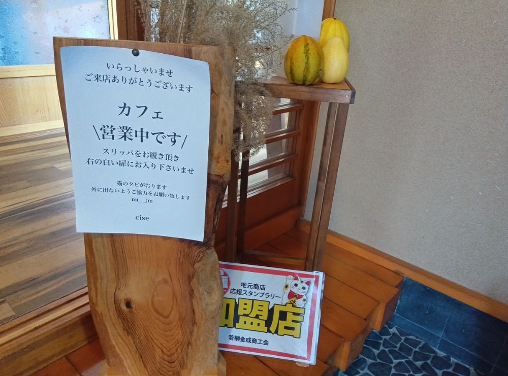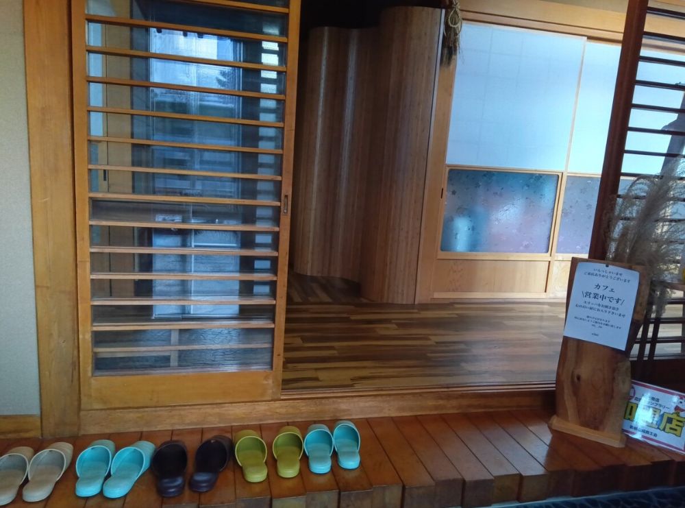 玄関の扉を開けるとスリッパが並べられており、カフェへの案内がありました。