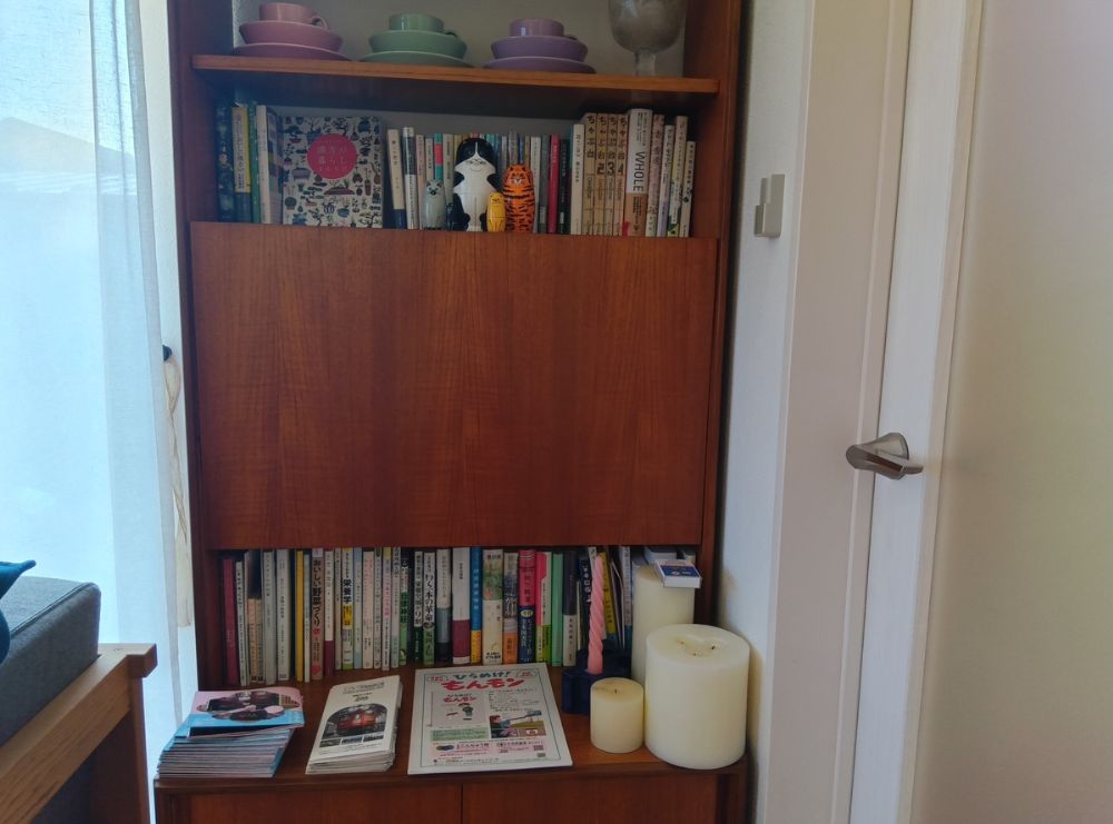 本棚から、可愛らしい猫のマトリョーシカがお出迎えしてくれました。