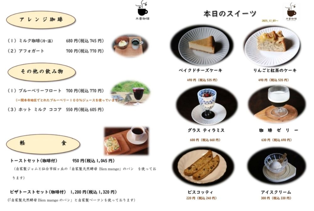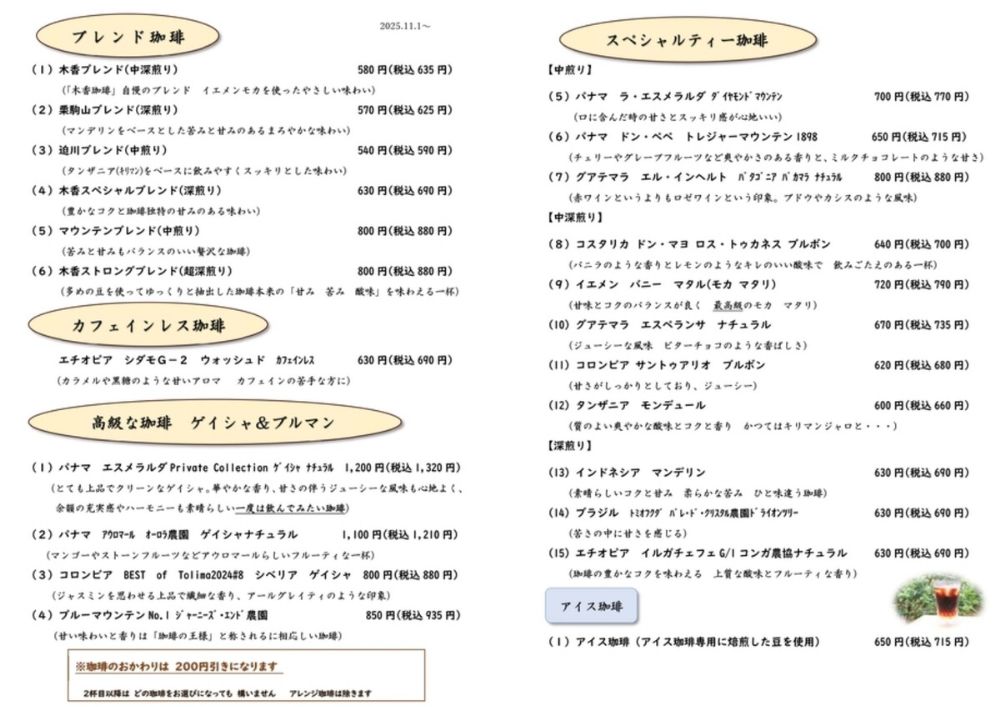 (木香珈琲さんよりいただいたメニュー画像を表示しております。)