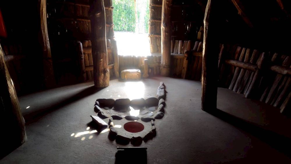 こちらは復元住居(10号居住跡)内部ですが、木の色が上下で違っていて燻蒸の跡がはっきりわかりますね。