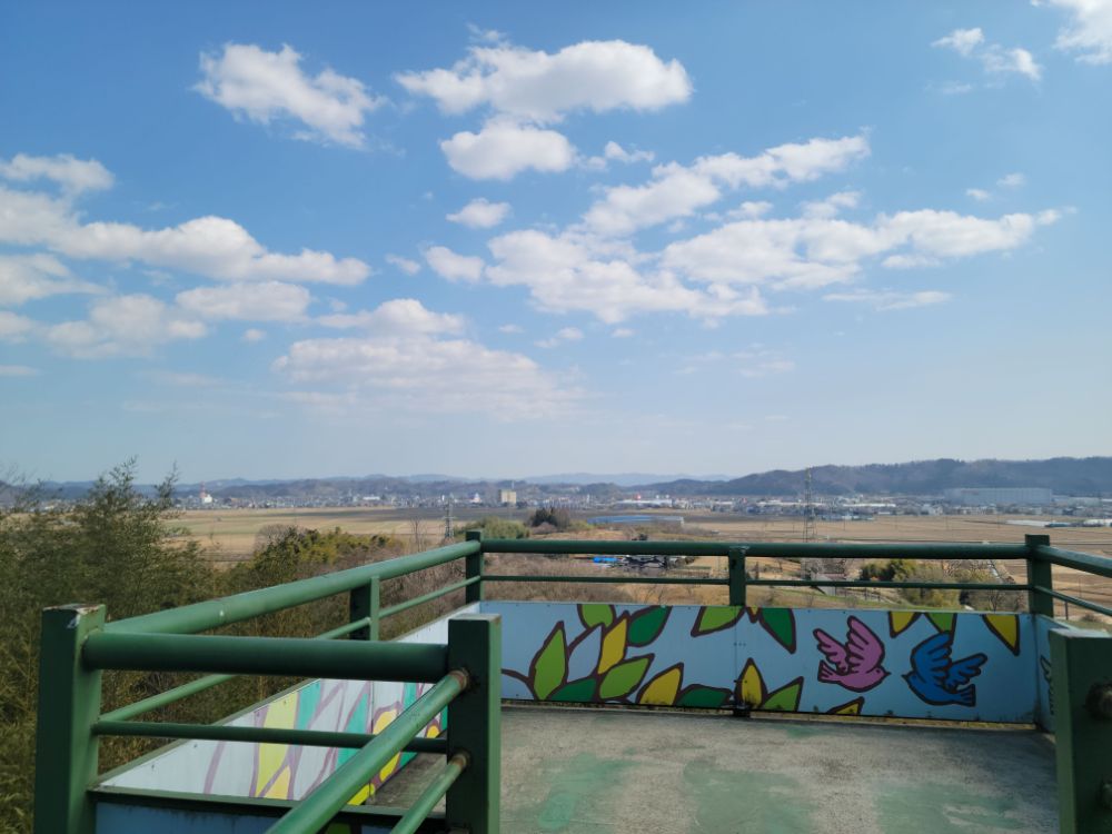 さらに進むと遊具や展望台があります。展望台からの眺めは最高で、大河原の町が遠くに見えます。