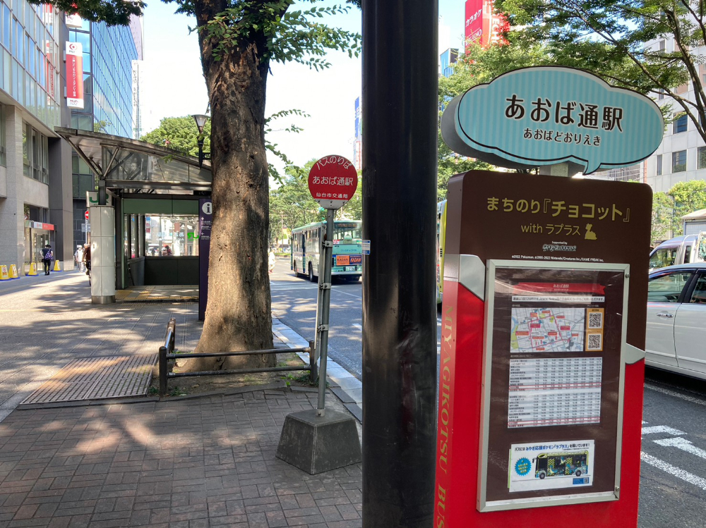 青葉通りに面したバス停は自転車屋さんの前にあります。こちらのエリアはサンモール一番町という名のアーケードに程近く、老舗百貨店やハイブランドのお店もあります。地下鉄青葉通一番町駅にも近いです。