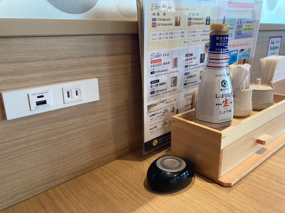 しっかりとした味付けの生姜焼きが美味でした。テーブルにはコンセントとUSBポートもあります。