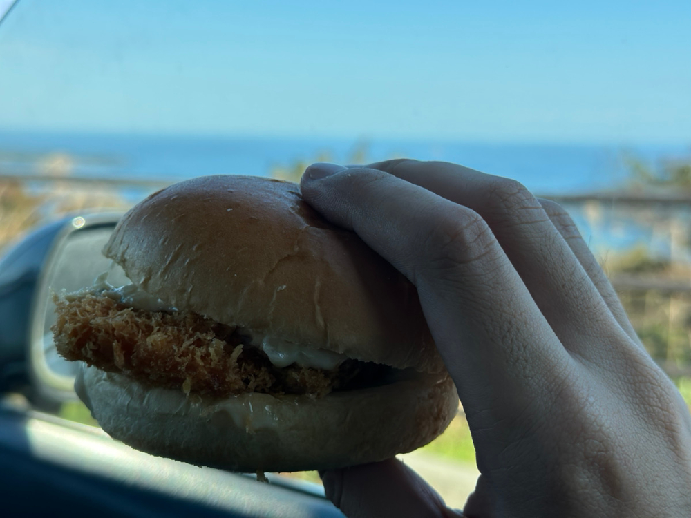 実は道の駅内で【女川バーガー】なるものを購入していました。きれいな海の景色を眺めながらいただこうという算段です。