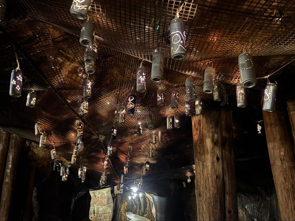 奥へ進むと、思い思いの絵や文字が描かれたカンテラが光り輝いていました。カンテラとは、石油を燃やして明かりを得る照明ランプのことです。薄暗い坑道を暖かく照らす光景はとても幻想的でした。