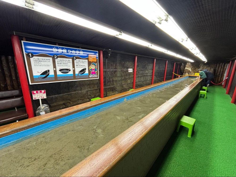 坑道の中では、砂金採り体験もできます(土日祝と夏休みのみ営業)。水温はヒーターで一定に保たれているので、寒い日でも安心して体験できますよ。