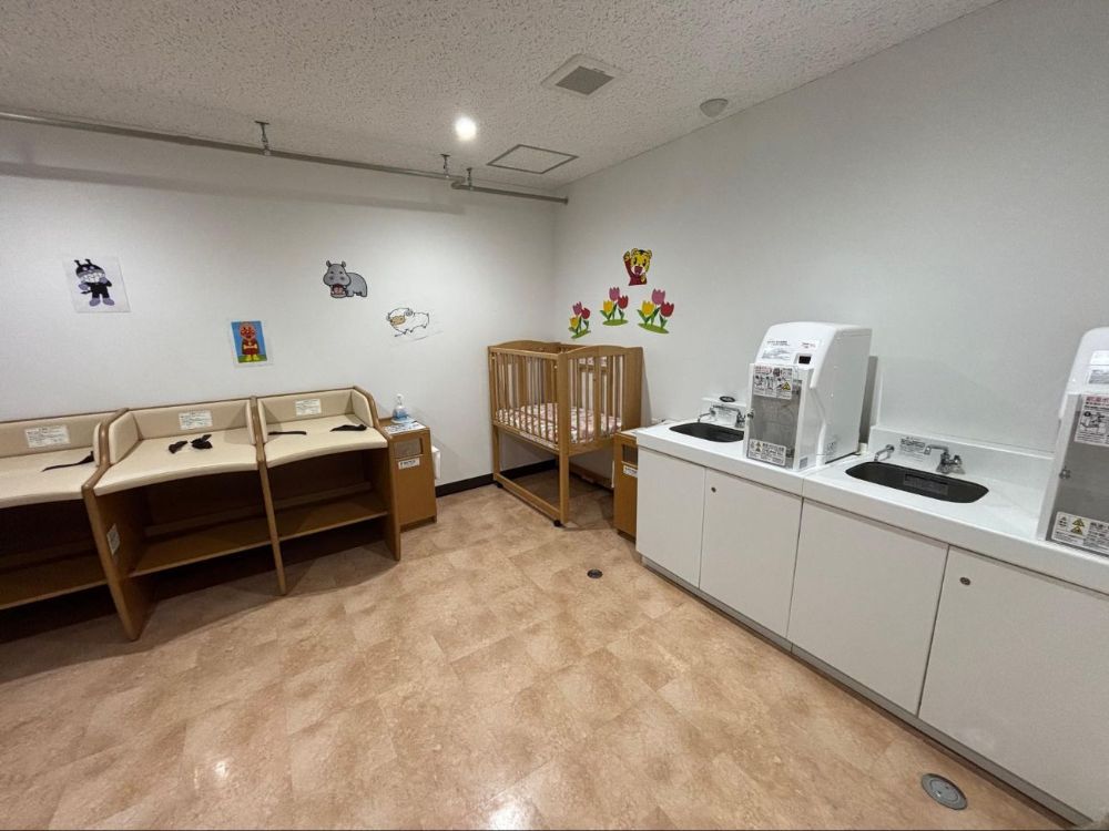 お土産売り場には、ベビールームもありました。広々としたベビールームには、おむつ交換台、ベビーベッド、調乳用のお湯まで用意されていました。小さなお子さんとのお出かけでも安心ですね!