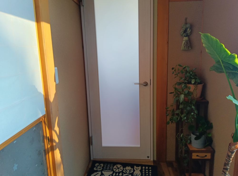 玄関の扉を開けるとスリッパが並べられており、カフェへの案内がありました。
