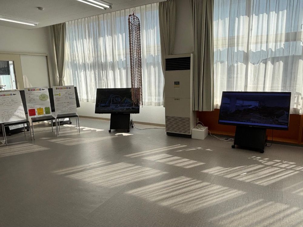 室内パークの隣はデジタル資料館です。資料館では、震災直後の東松島市の様子の写真、震災発生時に野蒜小学校内に設置されていた時計や黒板の実物を見ることができます。