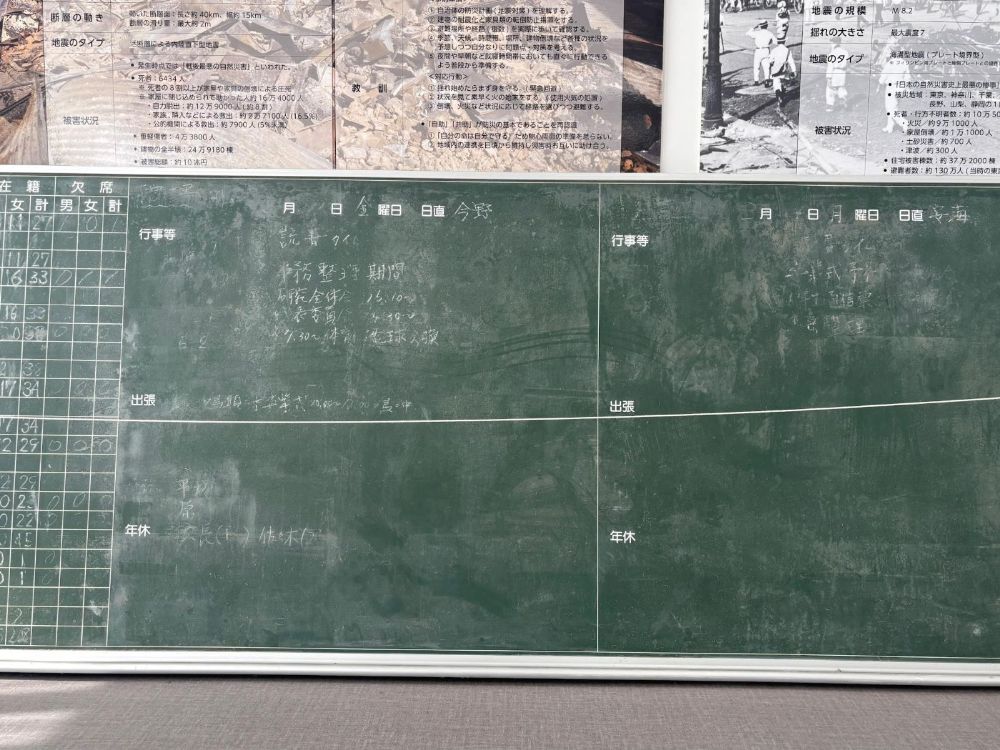津波が到達したであろう16時を指したまま止まった時計。消えかかった黒板。あらためて津波の脅威を思い知り、震え上がりました。