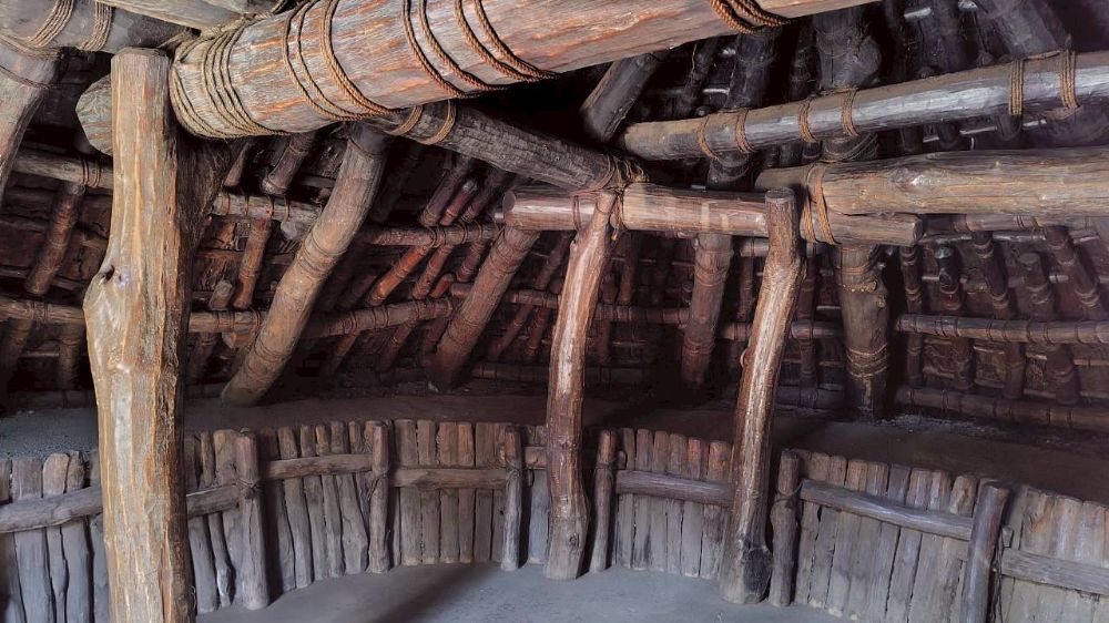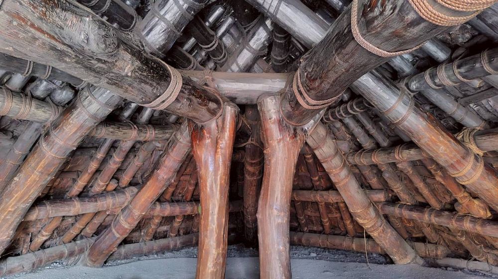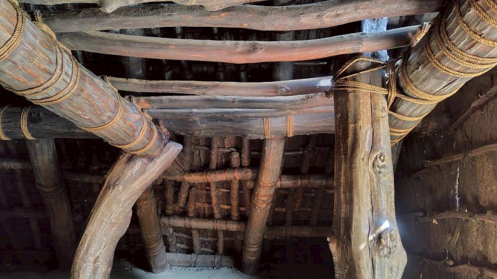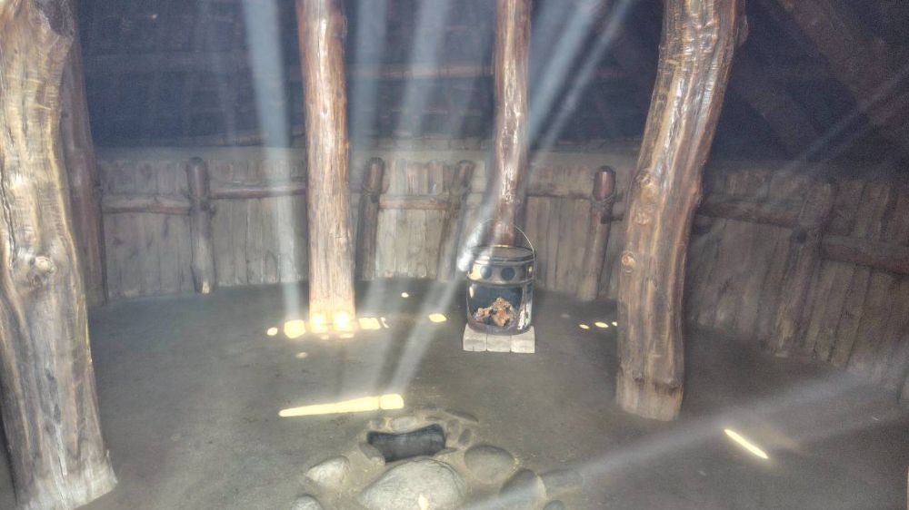 こちらは復元住居(10号居住跡)内部ですが、木の色が上下で違っていて燻蒸の跡がはっきりわかりますね。
