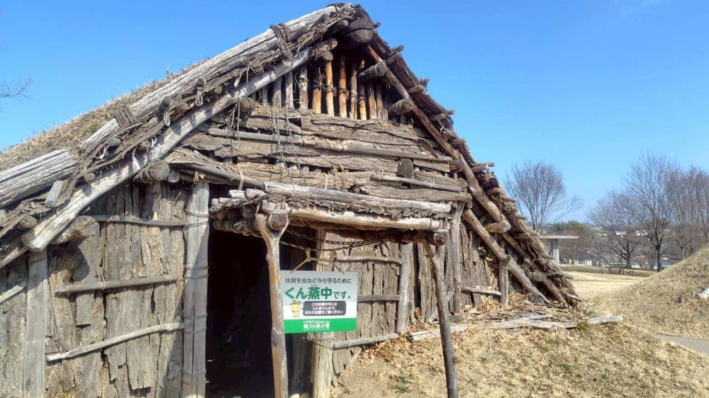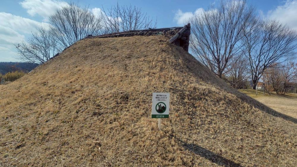 屋外には3棟の竪穴住居が復元されています。復元にあたっては、近年の発掘調査で明らかになってきた建築方法を取り入れ、クリの木材で骨組みを組み、その上に土をのせた「土屋根構造」が再現されています。
