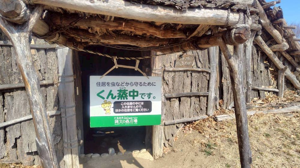 虫などから守るために、10:00~14:00まで燻蒸しているそうです。復元住居は3棟あるので毎日日替わりで行っているとのこと。