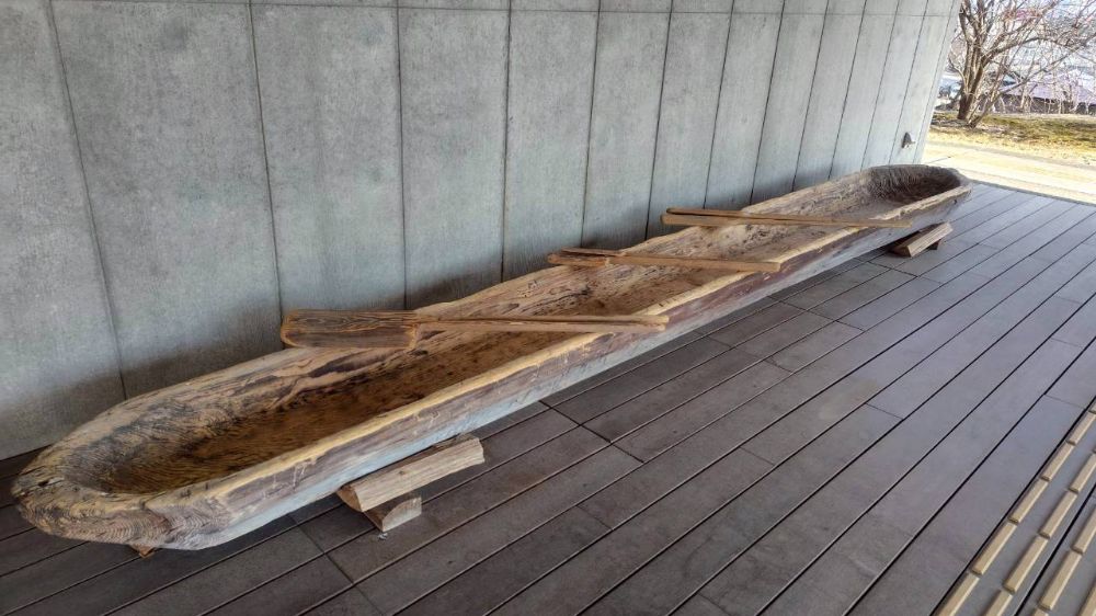 外に飾られている舟は2006年11月から2007年8月に来館された1,600名の方々が、石製の斧で丸太をくりぬいて作られたものです。