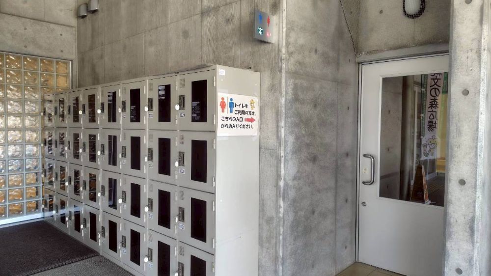 エントランス横にはお手洗いと返却式コインロッカーが設置されております。車椅子の利用も可能です。ご利用の際は受付にお声がけください。