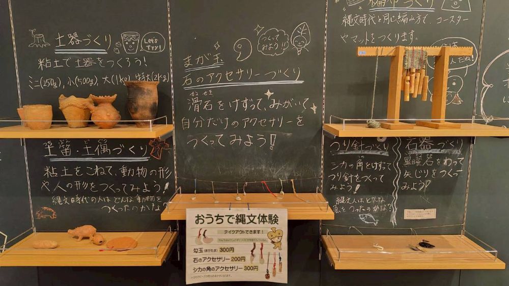 勾玉・石のアクセサリー作り、鹿の角のアクセサリー作り、縄文土器、土偶作り、火起こし、石器、つり針作り、編布作りが体験可能です。ものにより事前予約が必要になります。詳しくは公式ホームページをご確認ください。