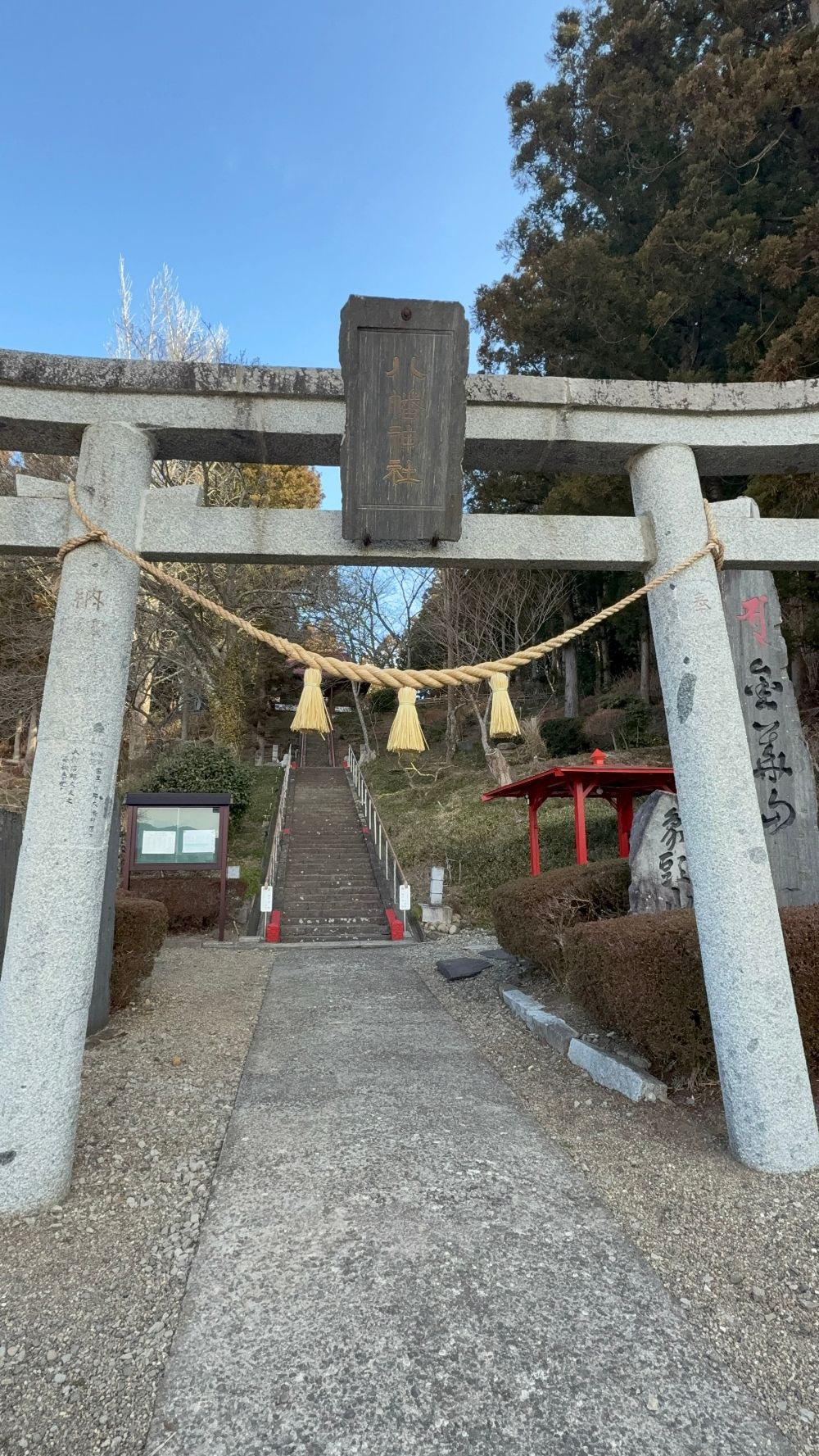 午前中に訪れたこともあり、境内はとても静かで落ち着いた雰囲気。鳥居の先に続く階段や木立に囲まれた景色からも、どこか凛とした空気が感じられました。