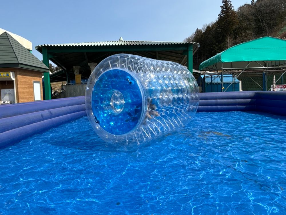 浮き輪に入って水上移動するウォーターホイール。立つのも難しく、浮き輪の中でコロコロと転がる姿は、乗らずに見ているだけでも笑ってしまいました。