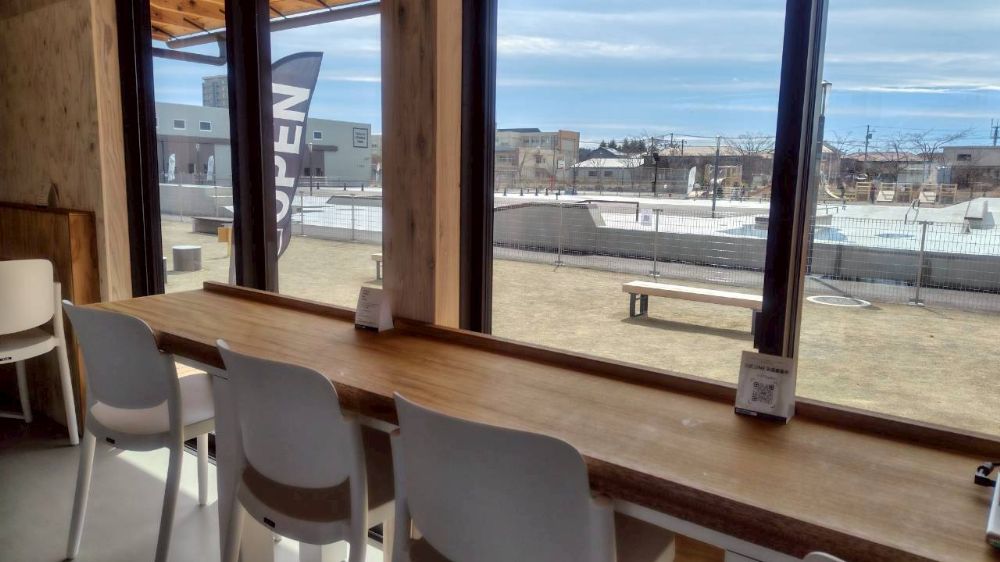 屋外スケートパークを眺めながらコーヒーを飲むのもいいですね。