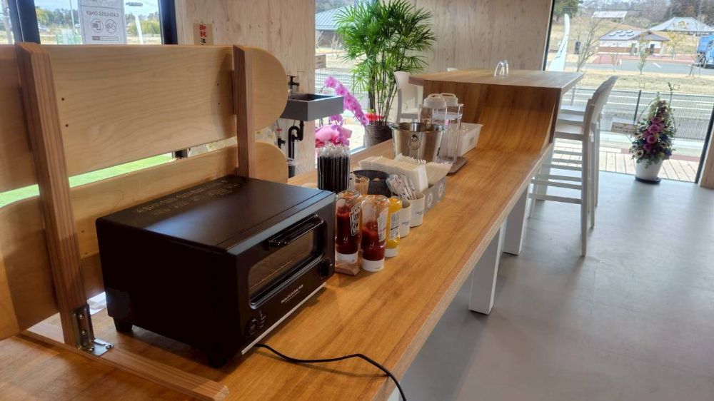 お水はセルフになります。トイレは屋外に男女各1つずつあります。