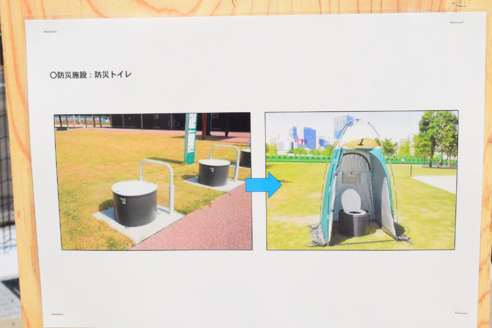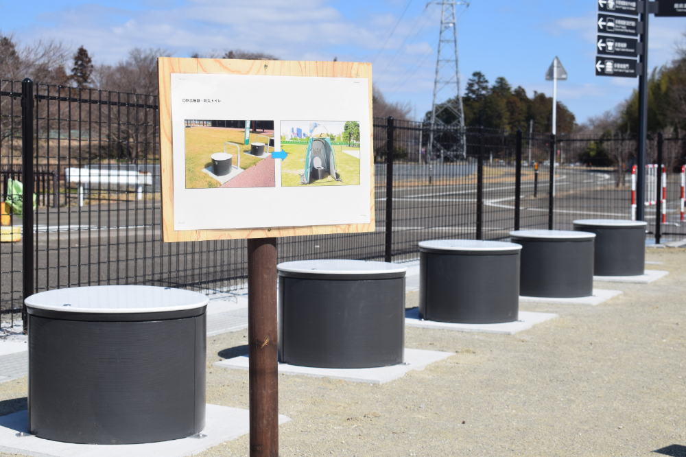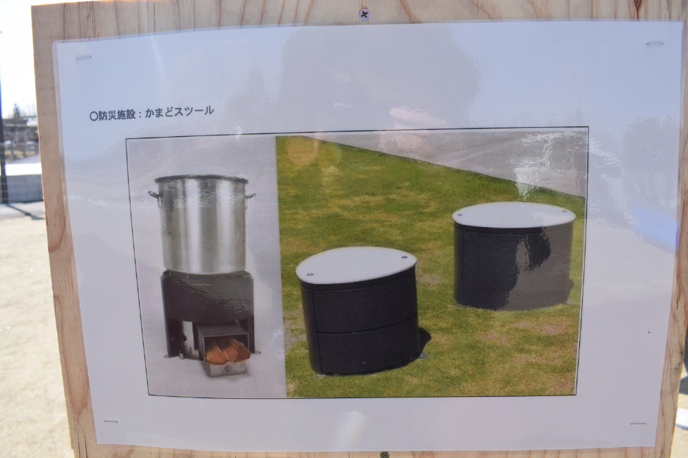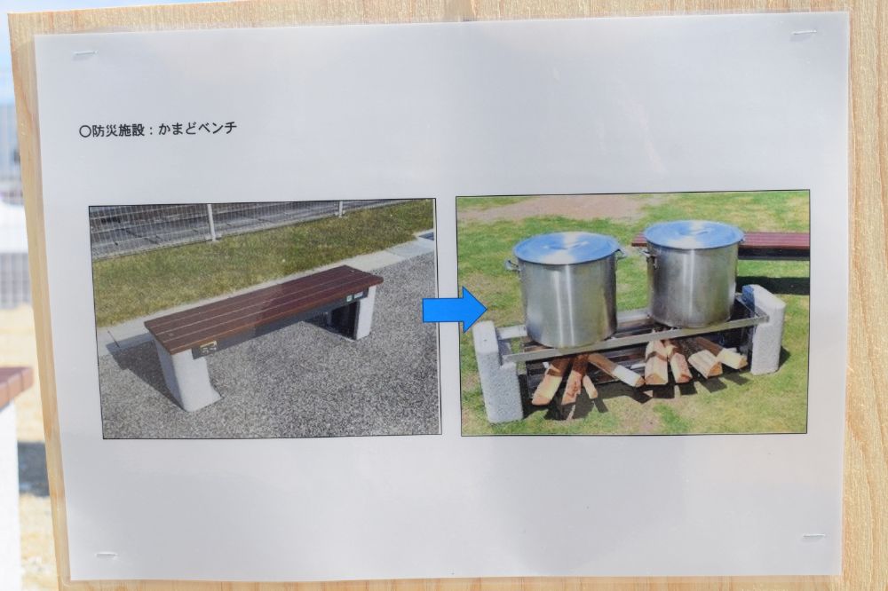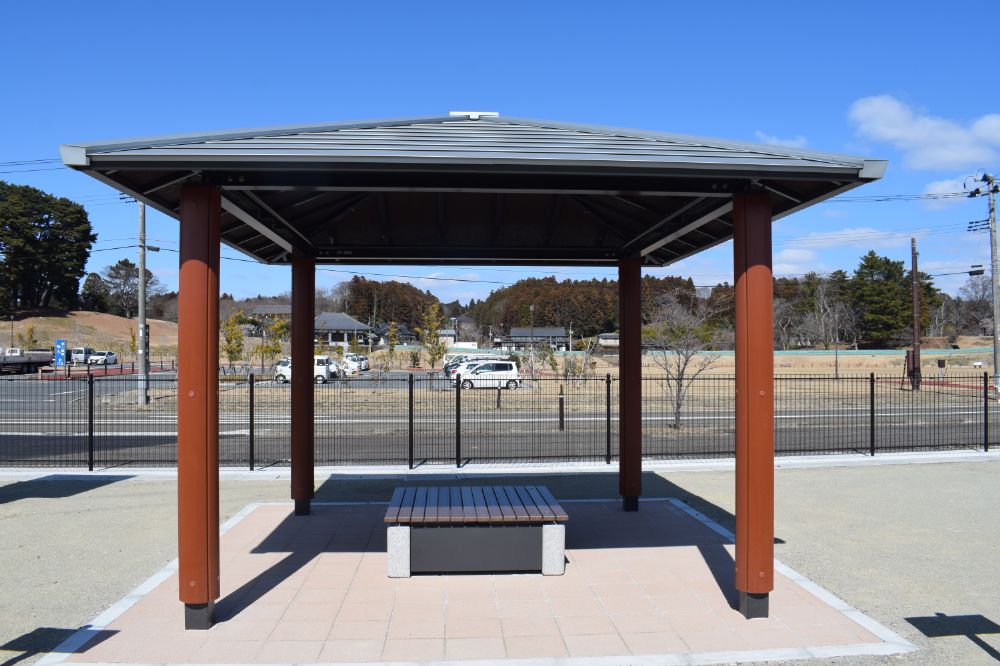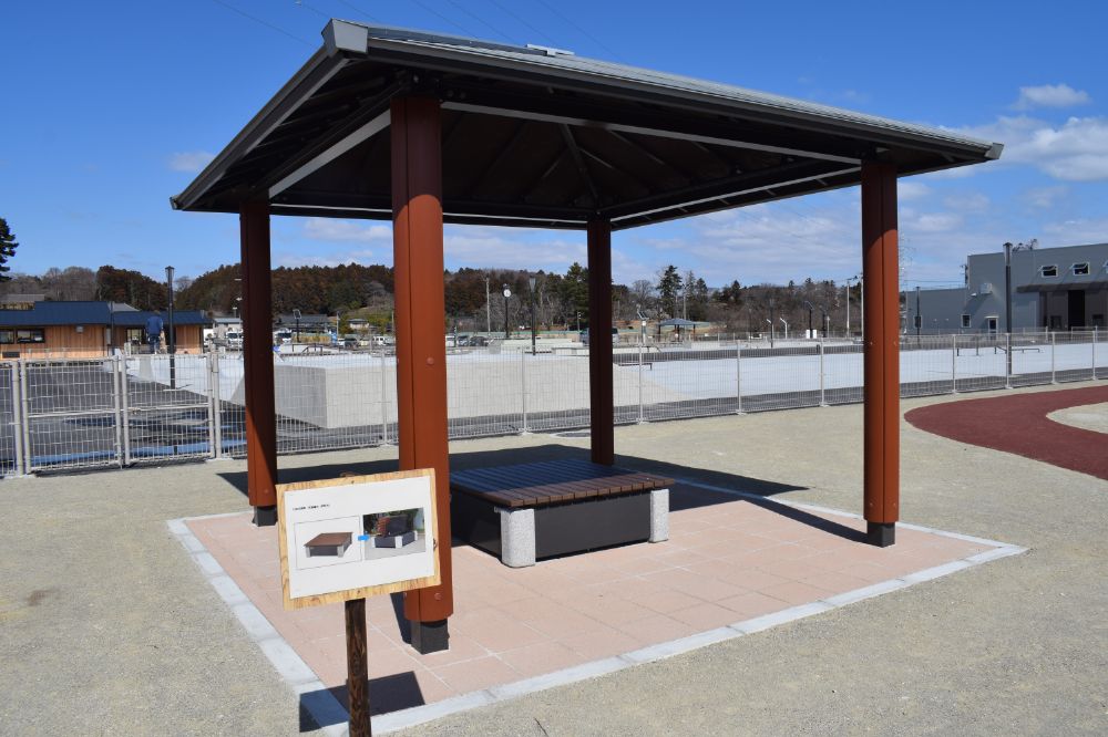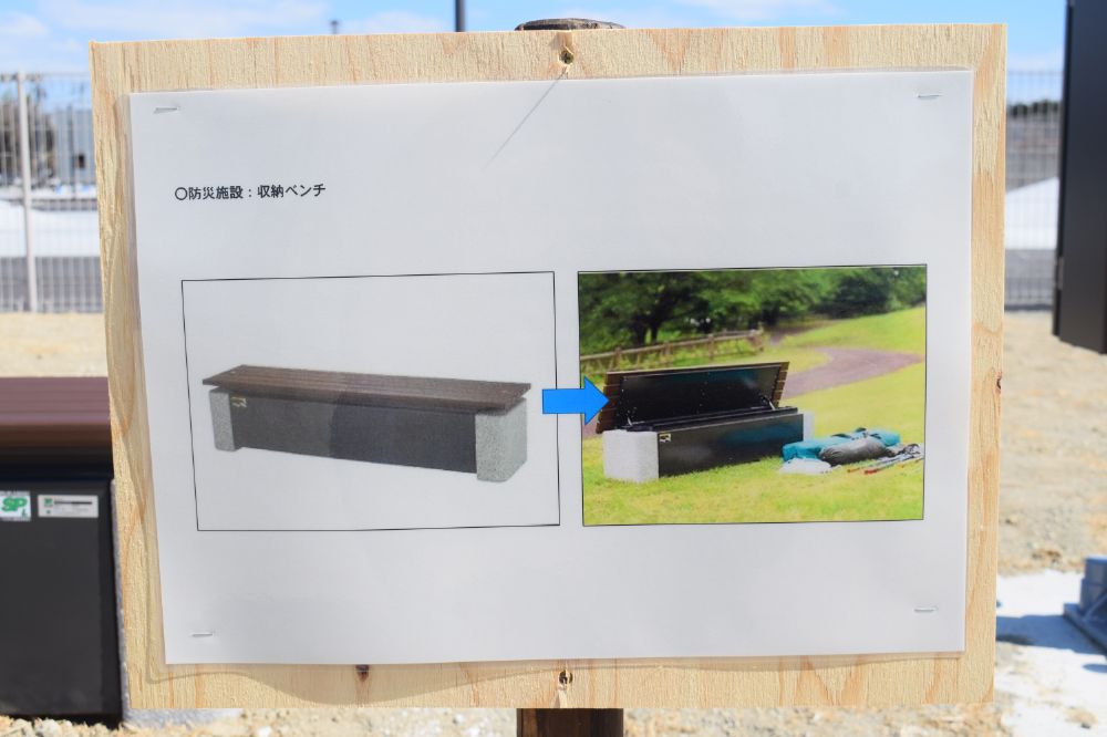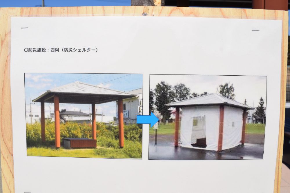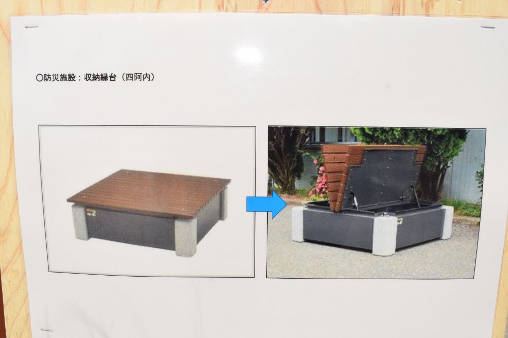 この東屋は収納縁台の中には防災用品が入っており、防災シェルターになります。