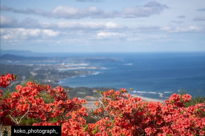 毎年、華やかに咲き誇る田束山のツツジ。遠くまで広がる三陸の海を眺めながら、美しく咲く赤いツツジを愛でたくなる素敵な景色ですね。