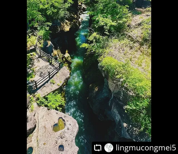 新緑の緑に囲まれ、春の柔らかな日差しが差し込む磊々峡。覗橋の欄干から望む可愛らしいハート型の岩のくぼみと川の水面がキラキラと光に反射する様子があいまって、トキメク恋心や愛の深さを思わず想像してしまう、まさに春恋旅行らしい1枚ですね。